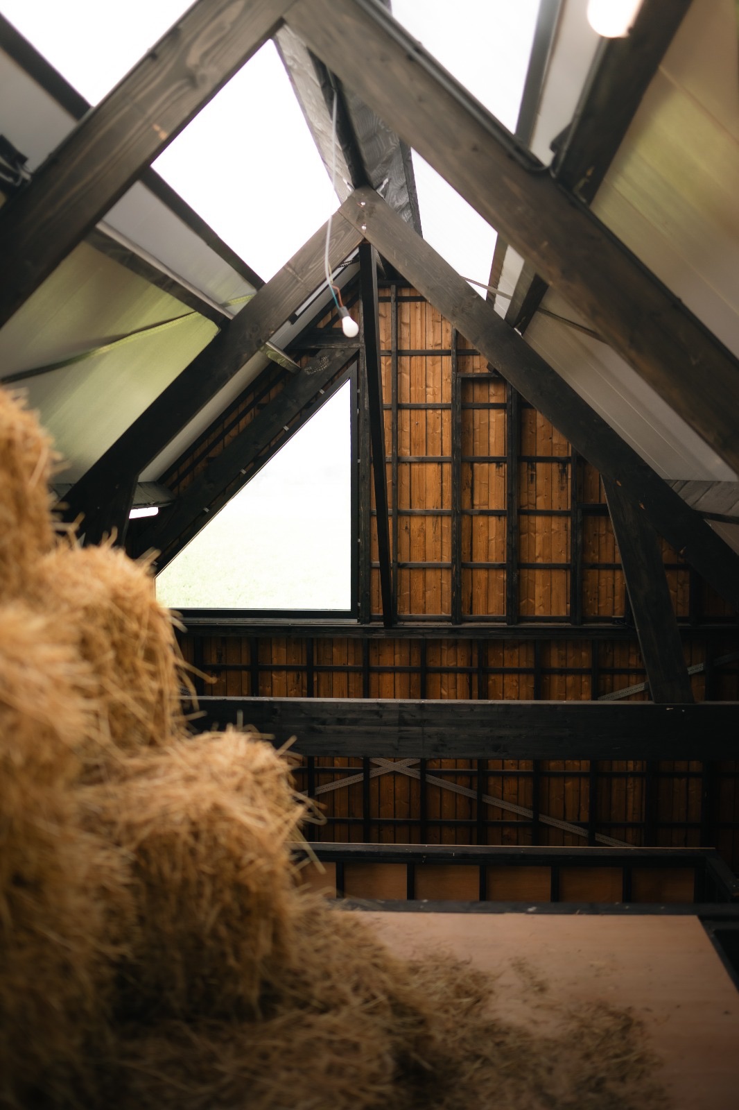 Strakke paardenstal in Scheldewindeke, gebouwd in houtskelet met een zwarte houten gevel en robuuste schuifpoorten.
